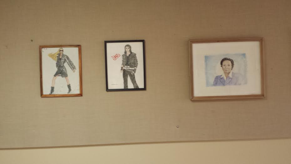 Here is one of the walls were I had put my Artwork on to it. In order from the left is Tome Cruise, my Auntie who tought me how to draw, my Mom, Aden Smith from after earth, and then Rihanna. You cannot see the drawings as well as how I would have liked in these shots. I wanted to make a record of them being up mostly.