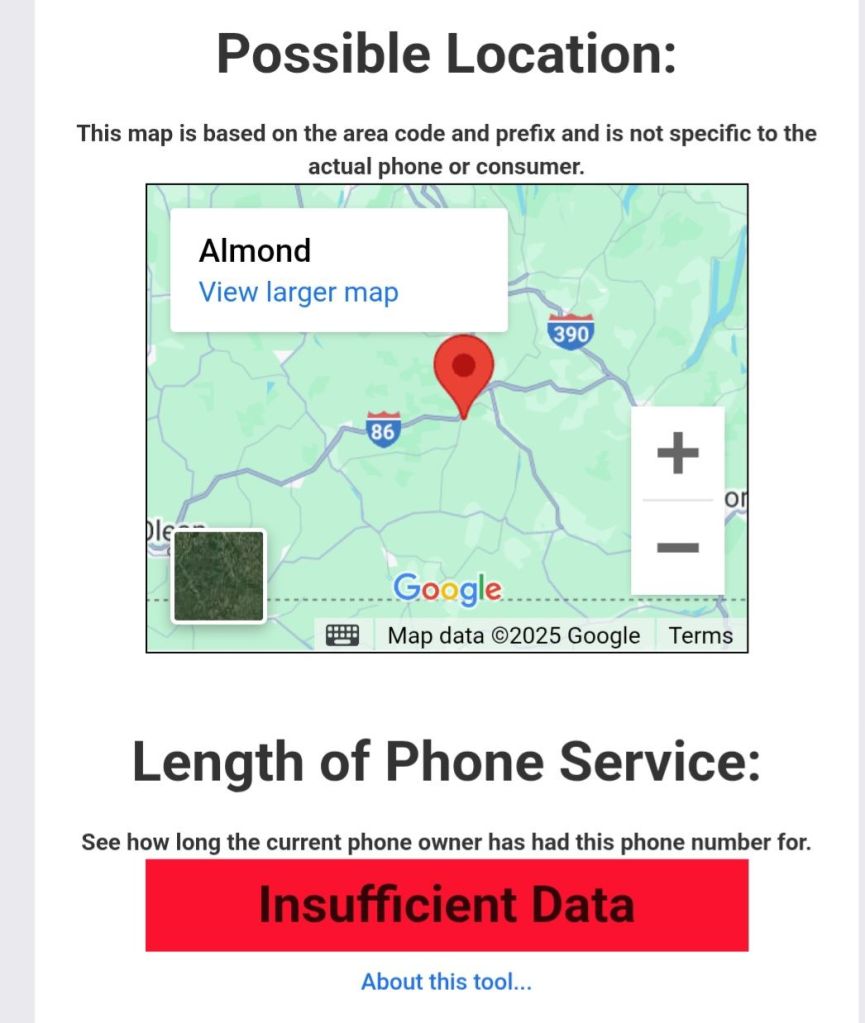 I looked on the internet for the location of this number, which called me from Almond, NY. They are usually landlines and spammers.