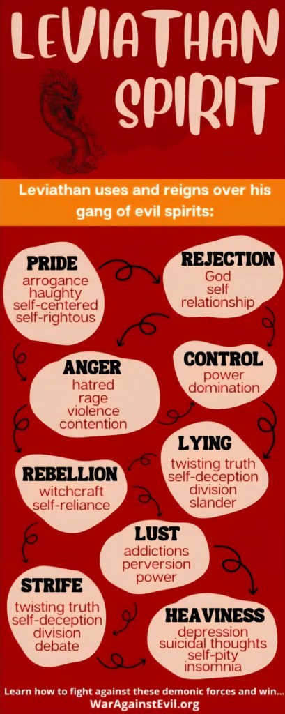 “Leviathan twists the truth. It misrepresents what has been said, causing people to sometimes believe the very opposite of what was said. Those under its influence hear things in a twisted way, and then pass on this twisted version, often believing it to be the truth. So this is definitely a spirit of deception.” (From Google search).